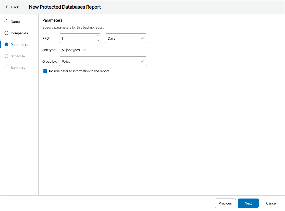 RPO defines a period between backup sessions, or, in other words, a period for which you can afford to lose data. For example, if protected databases must have daily backups, specify 1 day or 24 hours as the RPO value.