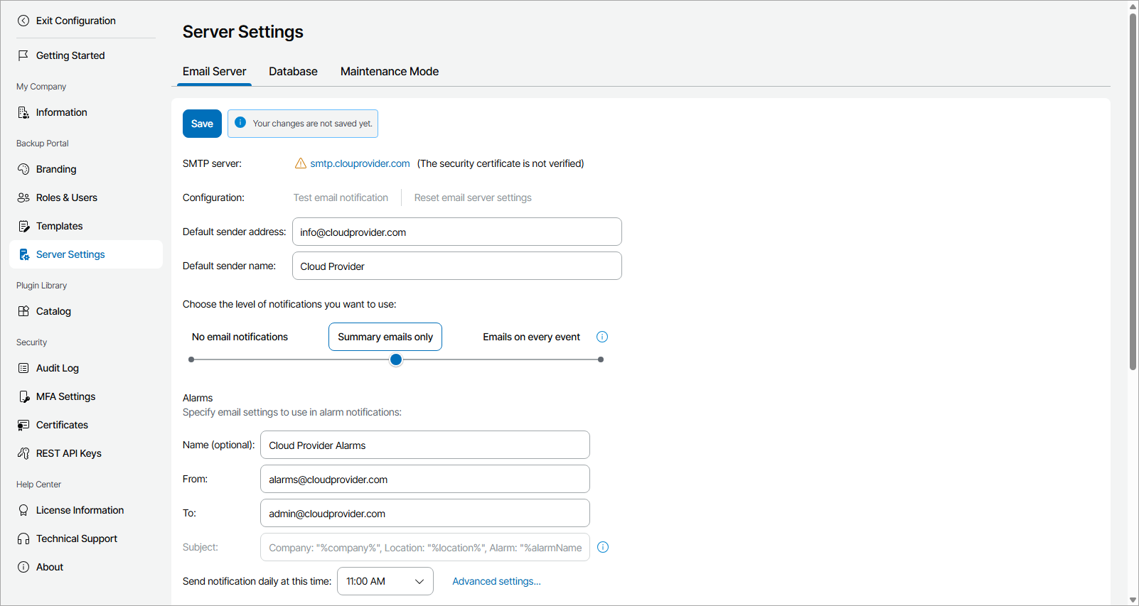 Veeam Service Provider Console will check the TLS certificate of the SMTP server. If the certificate is not trusted, Veeam Service Provider Console displays a warning.