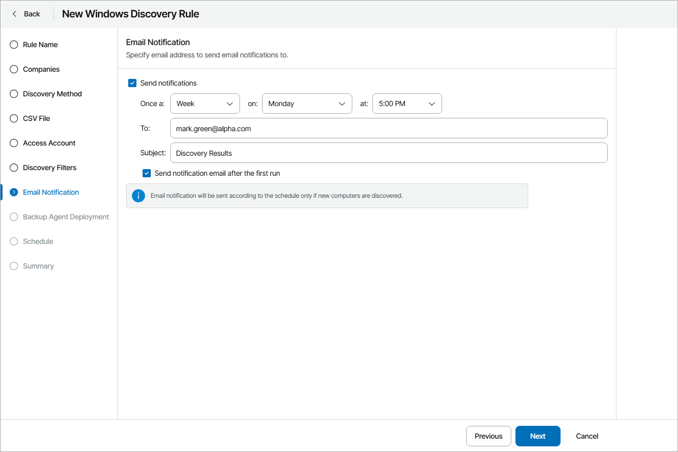 - At the Email Notification step of the wizard, you can enable notifications about discovery results by email.