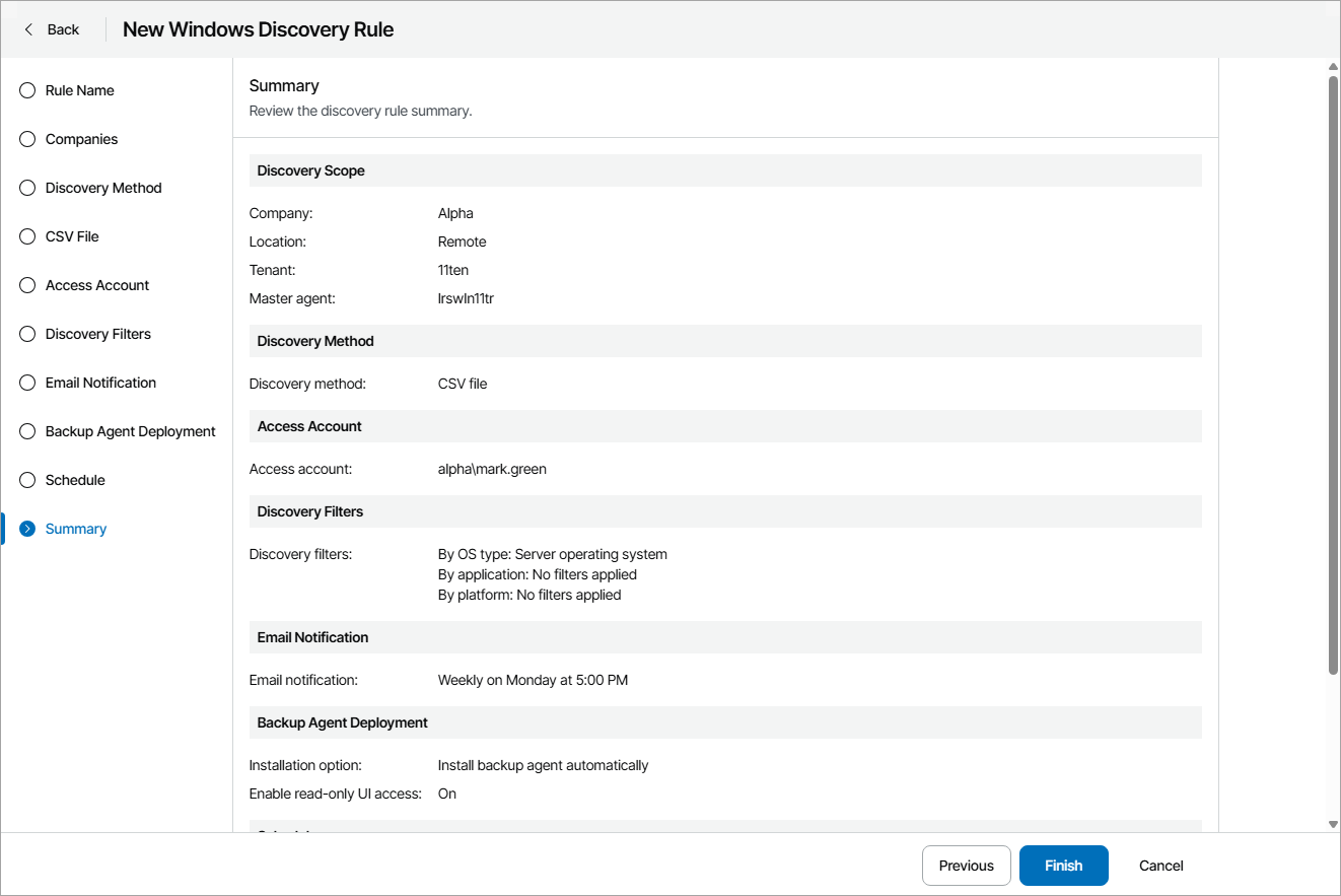 - At the Summary step of the wizard, review discovery rule settings and click Finish.
