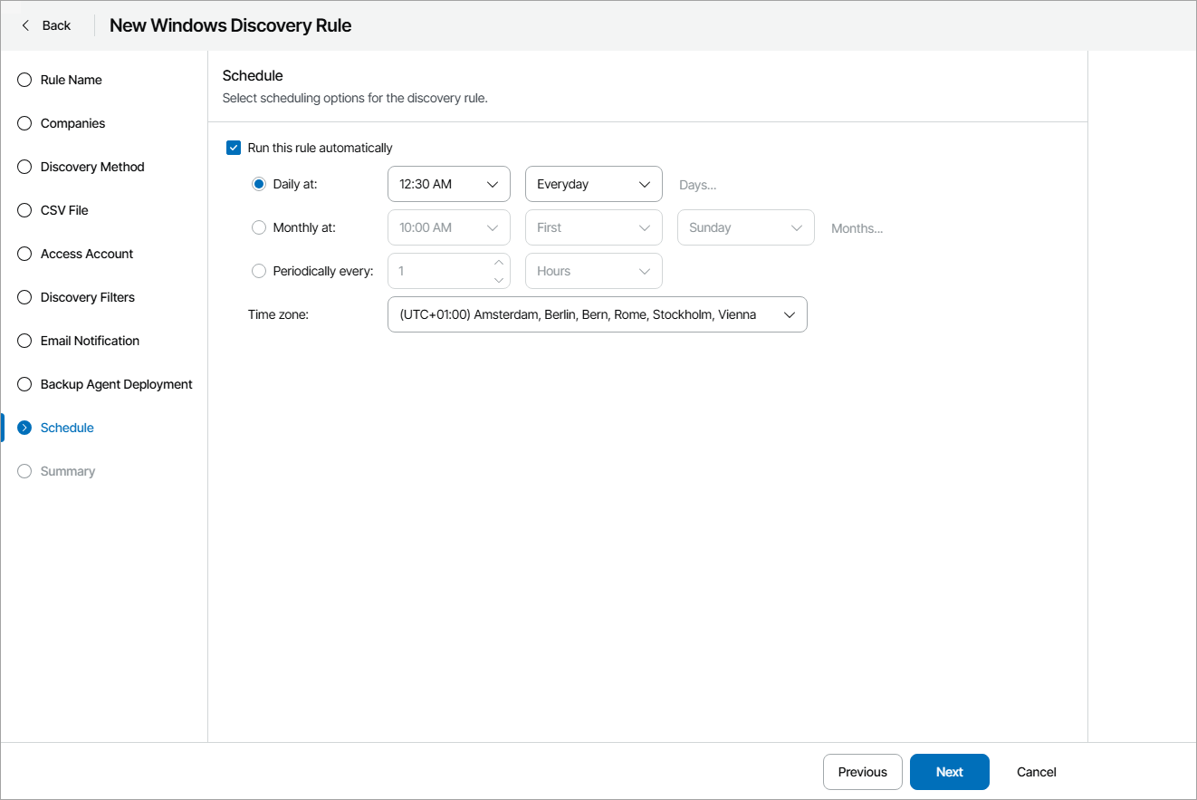 - At the Schedule step of the wizard, specify schedule according to which discovery must be performed: