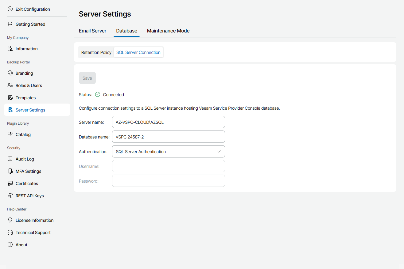 By default, Veeam Service Provider Console connects to the Microsoft SQL Server using credentials specified in the Veeam Service Provider Console Setup wizard.