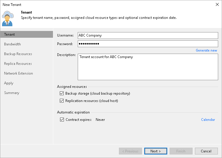 - The Username specified in Veeam Cloud Connect will be used as a Company Tenant user name in Veeam Service Provider Console after the created cloud tenant is mapped to a Veeam Service Provider Console company. For example, if the Username in Veeam Cloud Connect is Delta and the cloud tenant is mapped to a company Alpha, the Company Tenant must specify Alpha\Delta to log in to Veeam Service Provider Console.