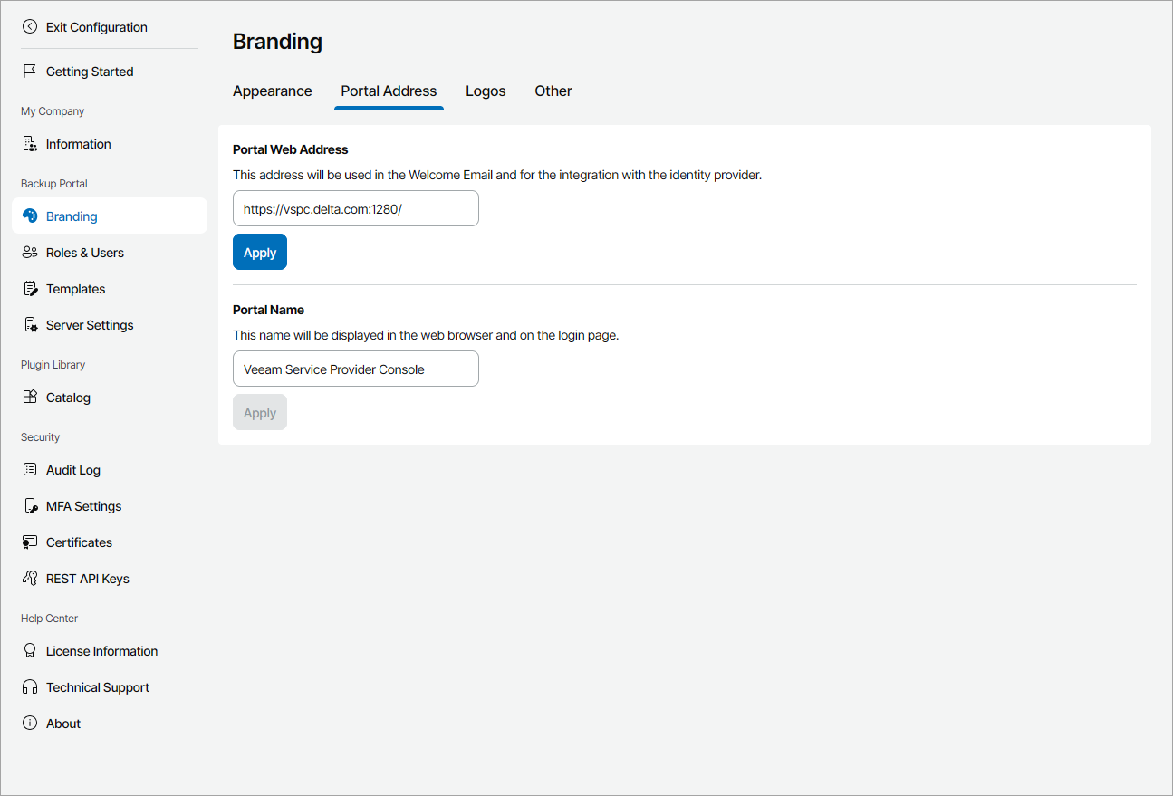 - In the Portal Web Address field, check the URL of the Veeam Service Provider Console.