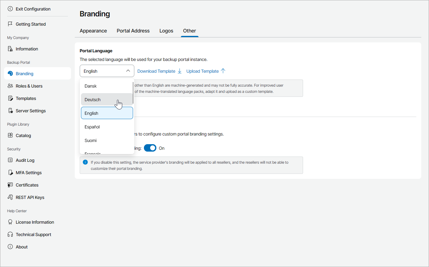 If you want to add a new language to Veeam Service Provider Console, you can upload a custom language package: