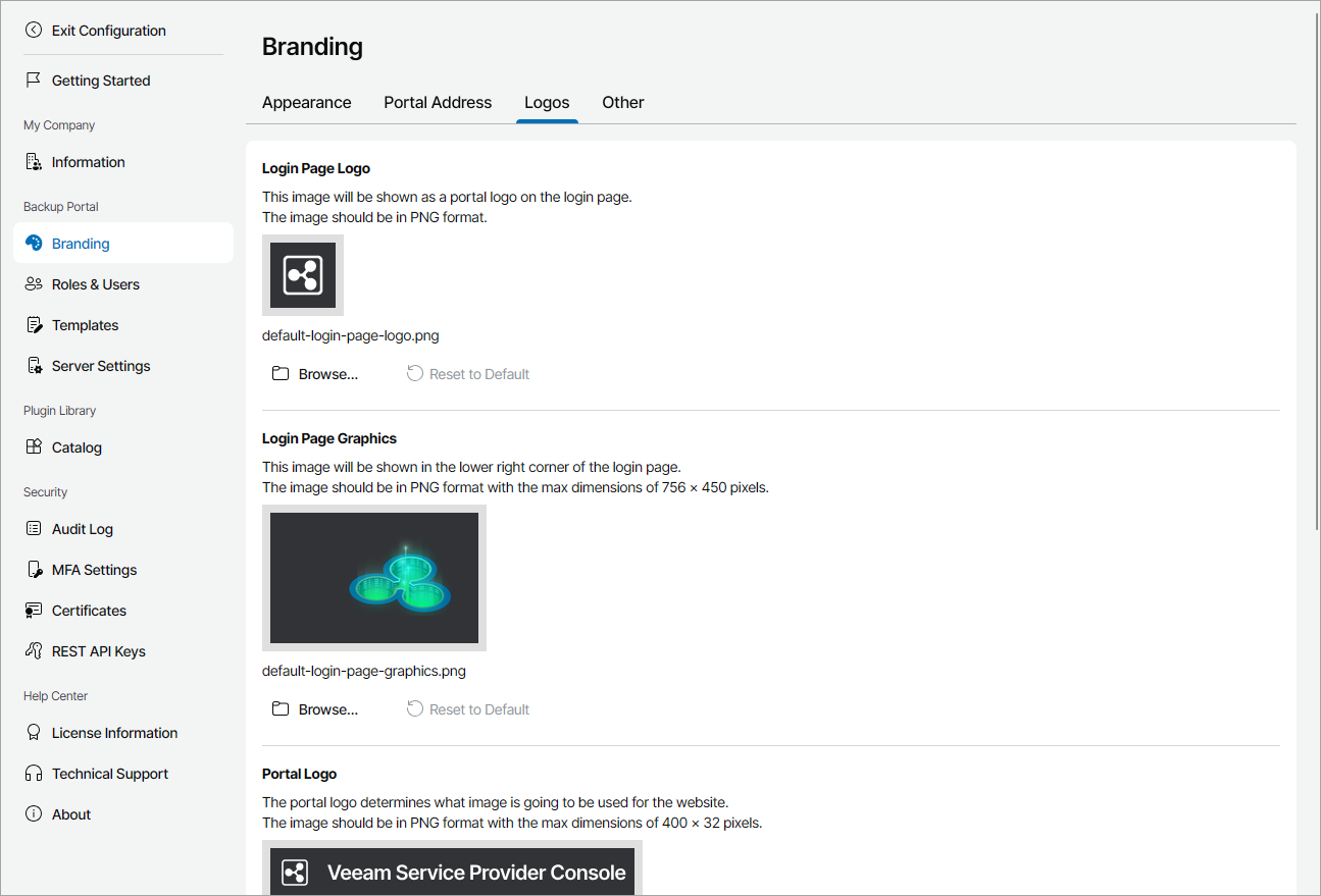 To replace the default company logos displayed in Veeam Service Provider Console portal, invoices, backup reports and email notifications: