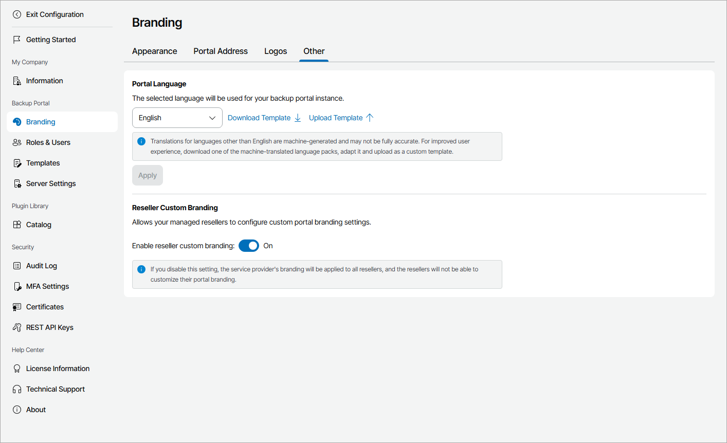 By default, custom branding is enabled for all managed resellers. If you disable this option, Veeam Service Provider Console will apply your branding settings for all resellers. Resellers will only be able to change the portal web address.