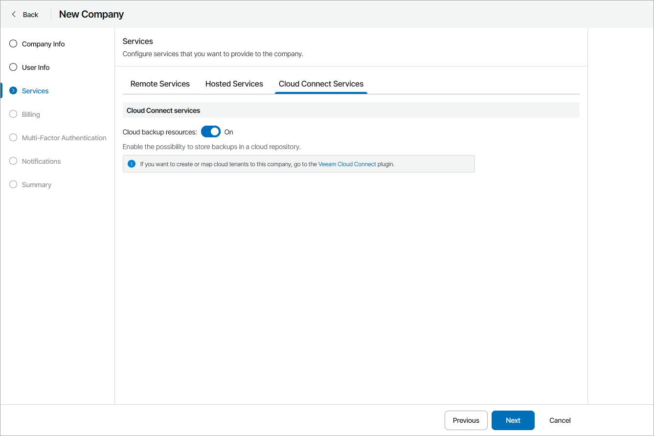 On the Cloud Connect Services tab, set the Cloud backup resources toggle to Off if you do not want the company to use Veeam Cloud Connect resources.
