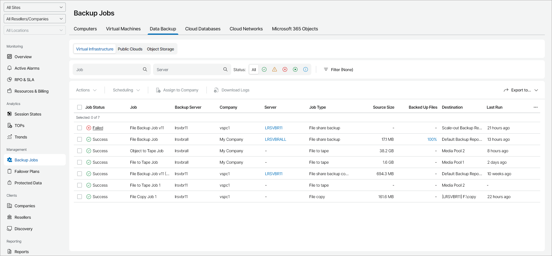 Veeam Service Provider Console will display a list of all file jobs configured on managed backup servers.
