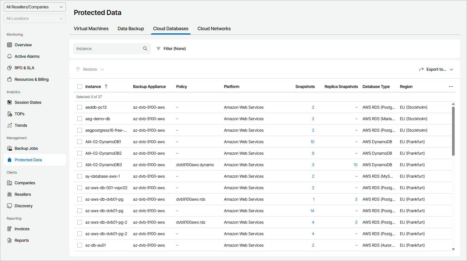 Veeam Service Provider Console will display a list of all cloud databases protected by Veeam Backup for Public Clouds.