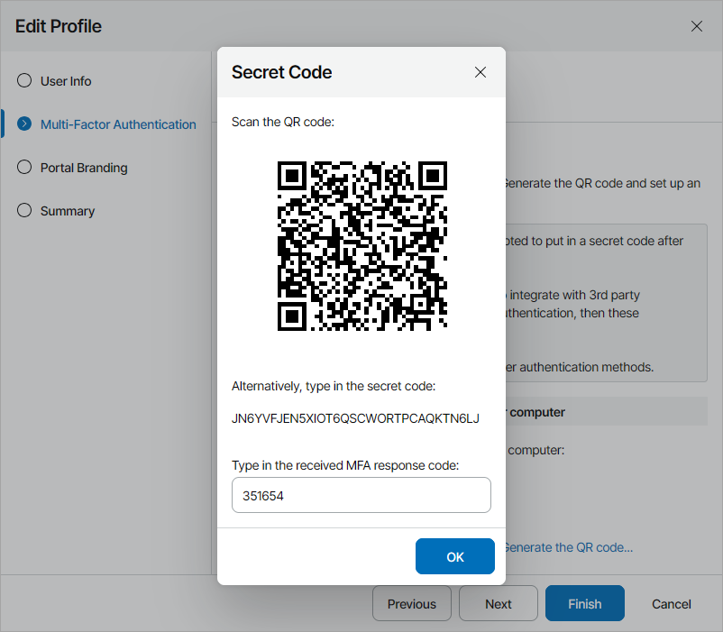 - In the Secret Code window, type in the response code generated by the authenticator application and click OK.