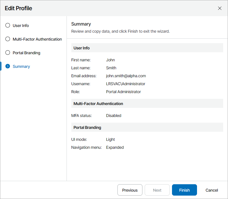 Administrator Portal users can specify contact information, configure MFA settings, and change the portal color scheme in the user profile. You may need to fill your user profile to enable MFA for your account and receive email notifications, such as alarm notifications.