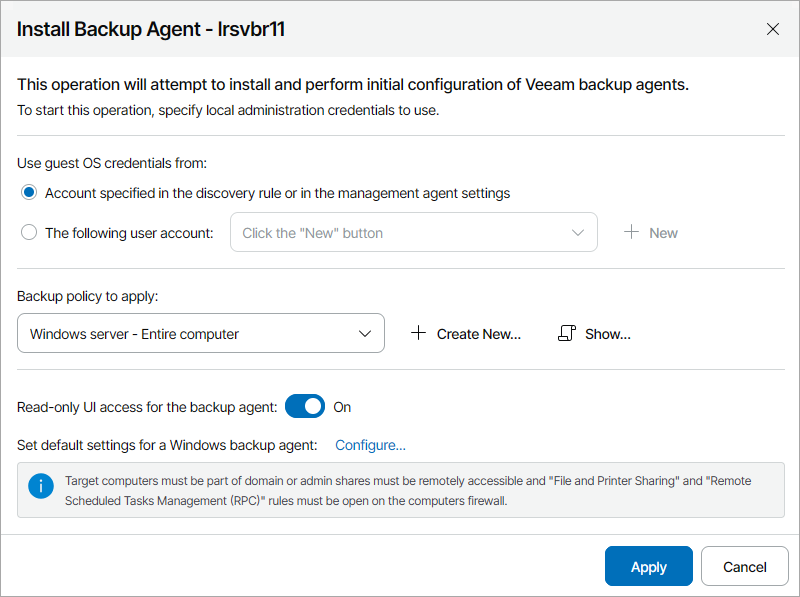 - By default, the read-only access mode is enabled for all Veeam backup agents. To disable the read-only access mode for Veeam backup agents, set the Read-only UI access for the backup agent toggle to Off.