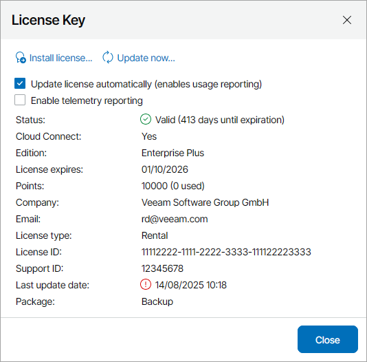 After you choose the license file, Veeam Service Provider Console will display the Install license file window to show the result of the license installation.