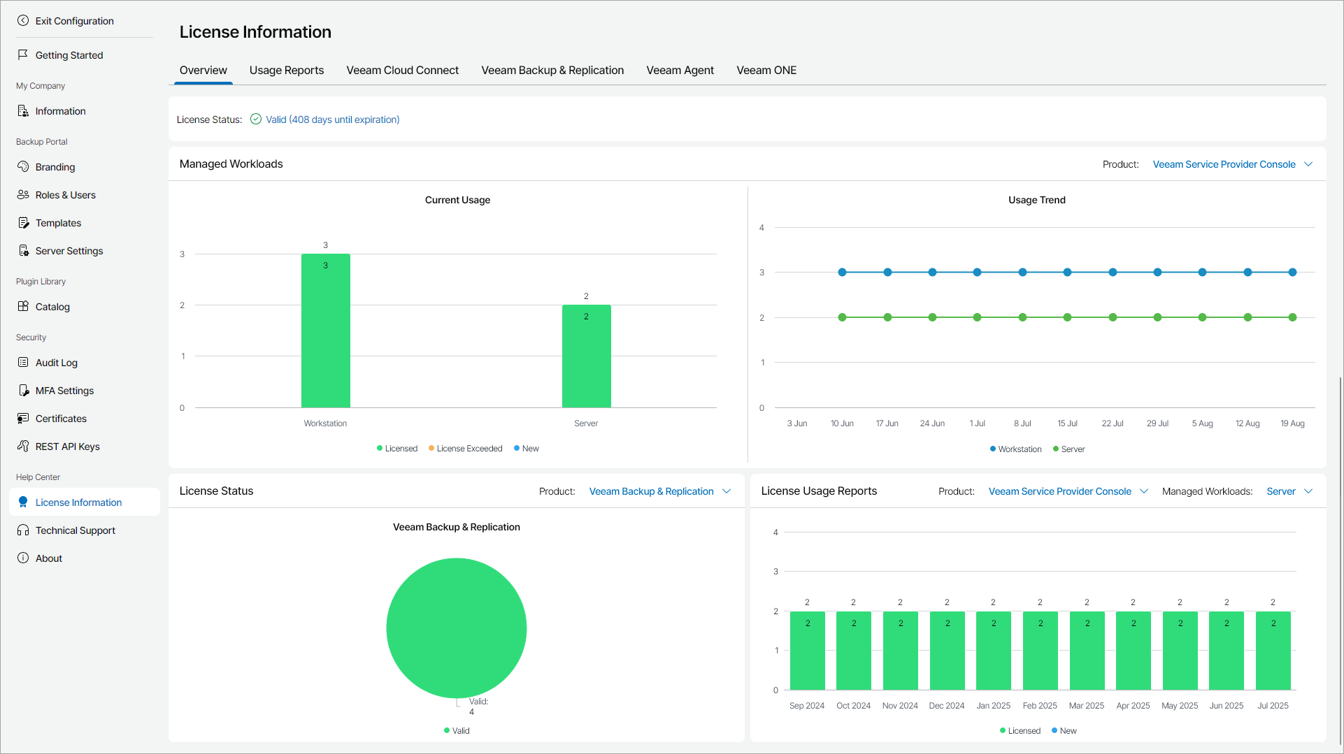 The Overview tab provides cumulative information about license usage for Veeam Service Provider Console, Veeam Cloud Connect, Veeam Backup & Replication, Veeam ONE and Veeam Backup for Microsoft 365.