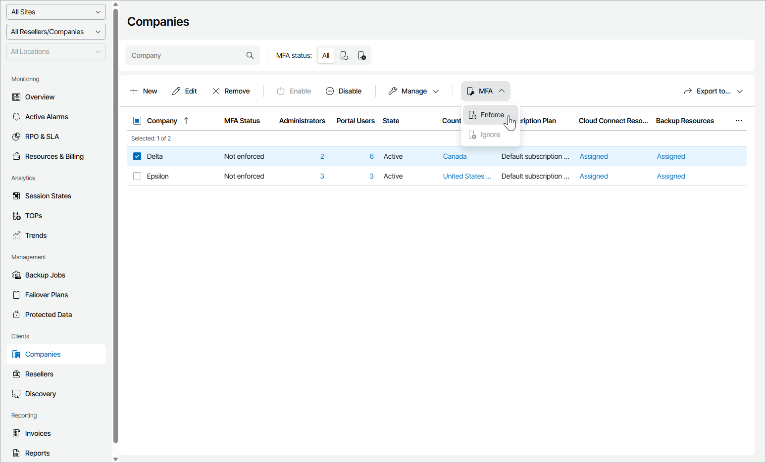 If the Enforce MFA for all managed clients and resellers policy is enabled or MFA is enabled for the reseller that manages the selected companies, you cannot disable MFA. For details, see MFA Policies. |