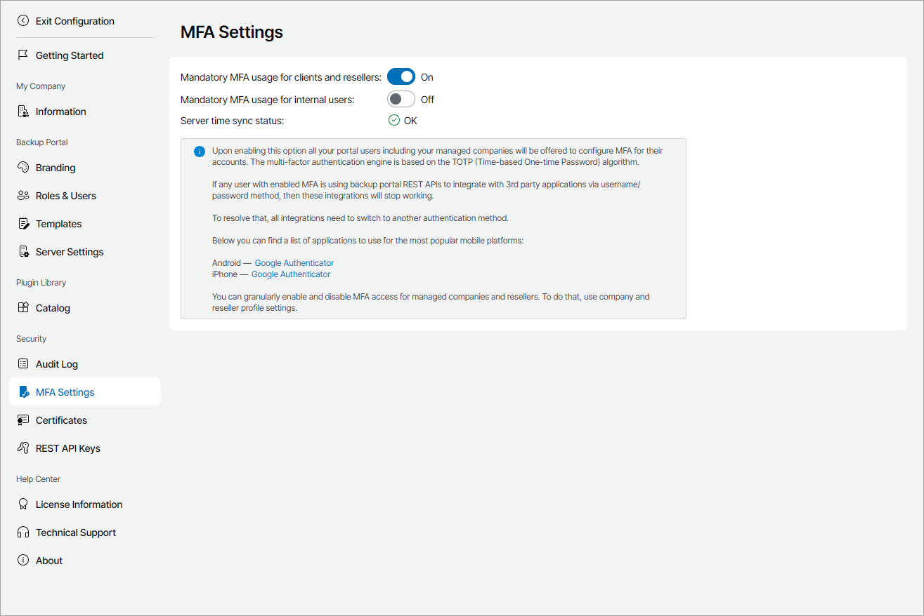 - Mandatory MFA usage for clients and resellers — enables notification about required MFA for all users of the managed companies and resellers.