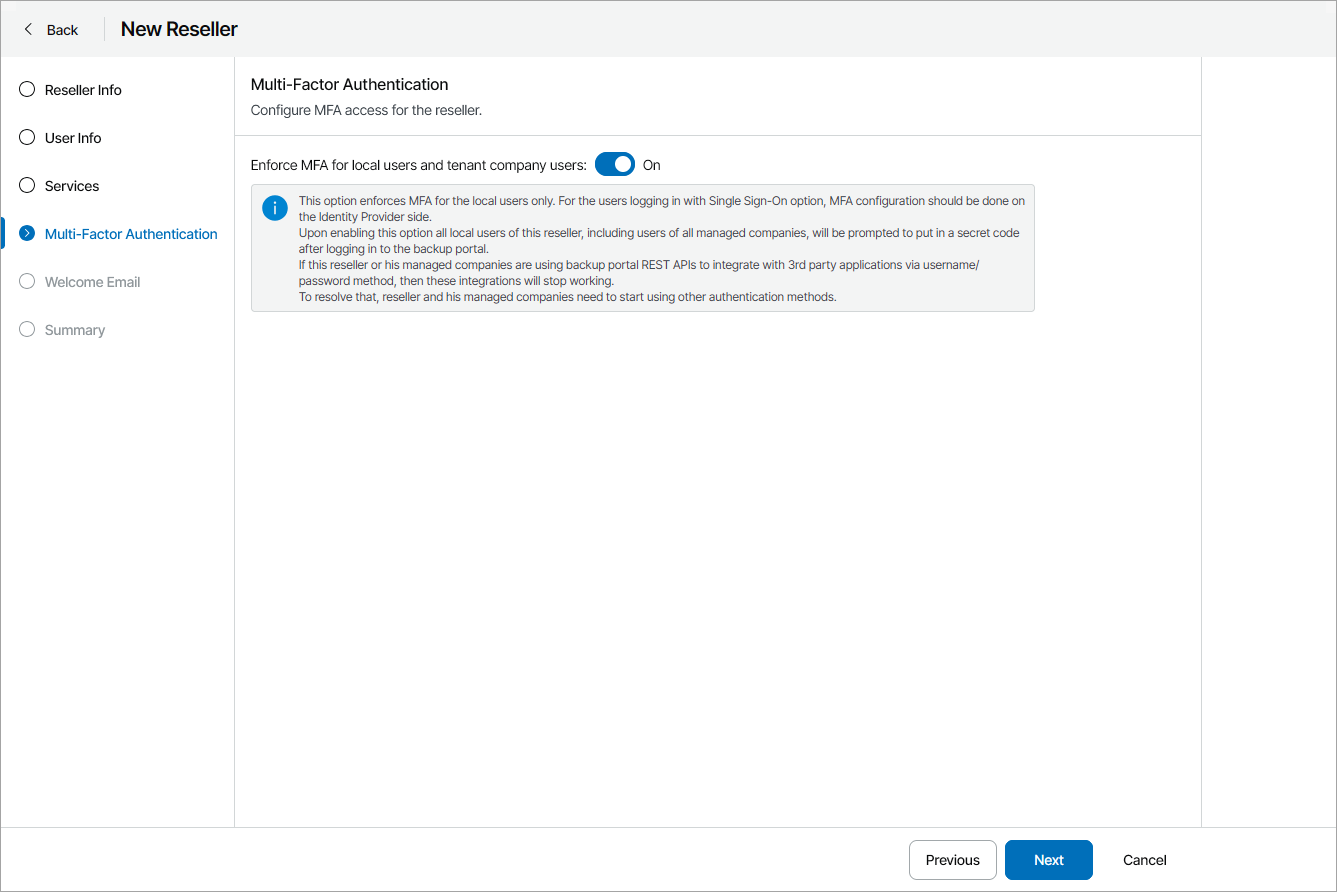 At the Multi-Factor Authentication step of the wizard, you can assign a second authentication factor to all reseller users and users of all assigned companies. For details on MFA, see Configuring Multi-Factor Authentication.