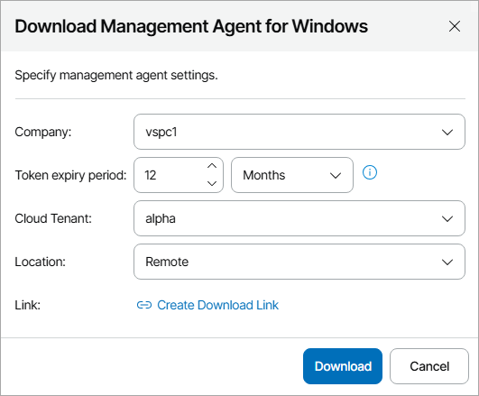 - In the Company, Cloud Tenant and Location lists, select an active company, cloud tenant account and company location to which you want to assign the management agent. Selected company, cloud tenant and location names will be added to the agent setup file name and the management agent will be preconfigured to connect to Veeam Service Provider Console with the selected company settings.