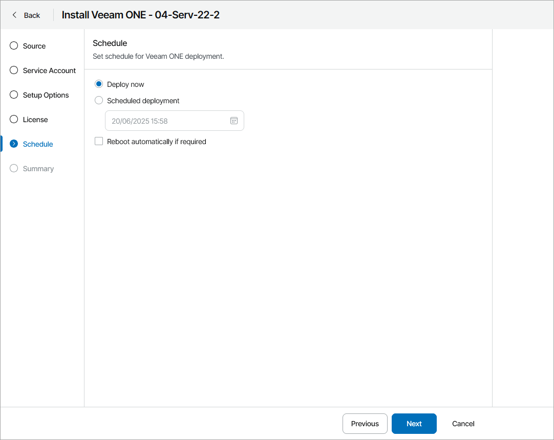 - At the Schedule step of the wizard, specify when you want to install Veeam ONE: