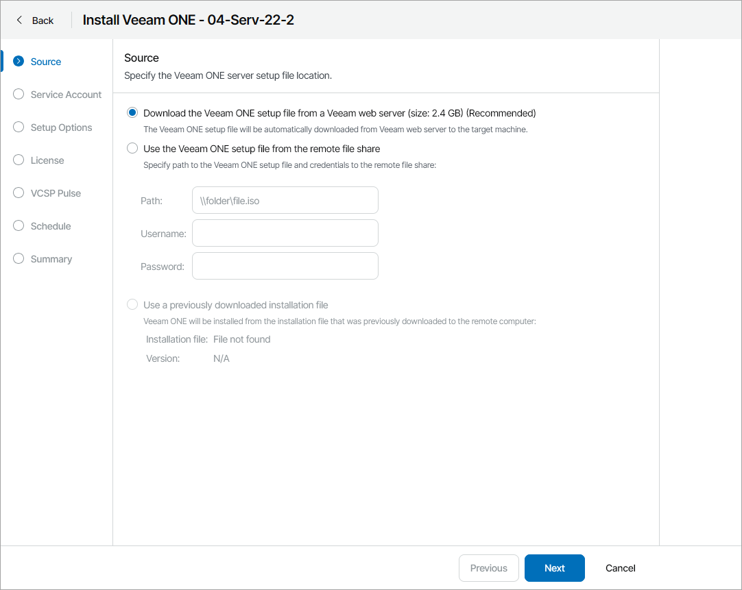 - To use a distribution stored on a remote file share, select the Use the Veeam ONE setup file from the remote file share option and specify the remote file share location and the credentials of the account that Veeam Service Provider Console will use to connect to the file share.
