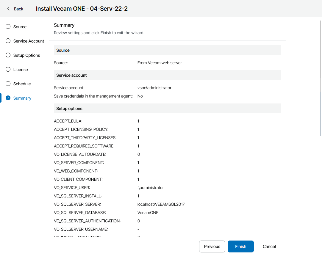 - At the Summary step of the wizard, review installation settings and click Finish.