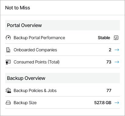 - Onboarded Companies section shows the number of companies managed in Veeam Service Provider Console. The arrow indicates whether the trend has increased, decreased or remained the same in the last 30 days.