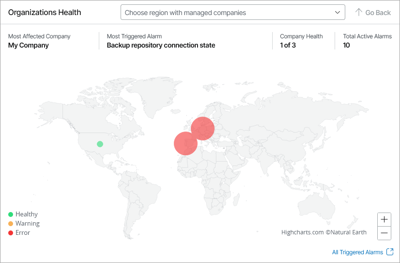 To view active alarms triggered for the selected country, click a region. Veeam Service Provider Console will open the Active Alarms dashboard. For details on working with alarms, see Working with Triggered Alarms.