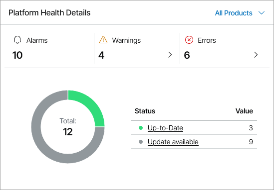 This widget shows the update status and the number of triggered alarms for managed Veeam products. To view details for a specific product, use the list at the top right corner of the widget.
