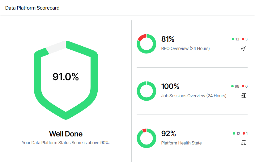 This widget calculates the data platform status score based on the status of protected workloads, finished jobs, and triggered alarms in the last 24 hours.