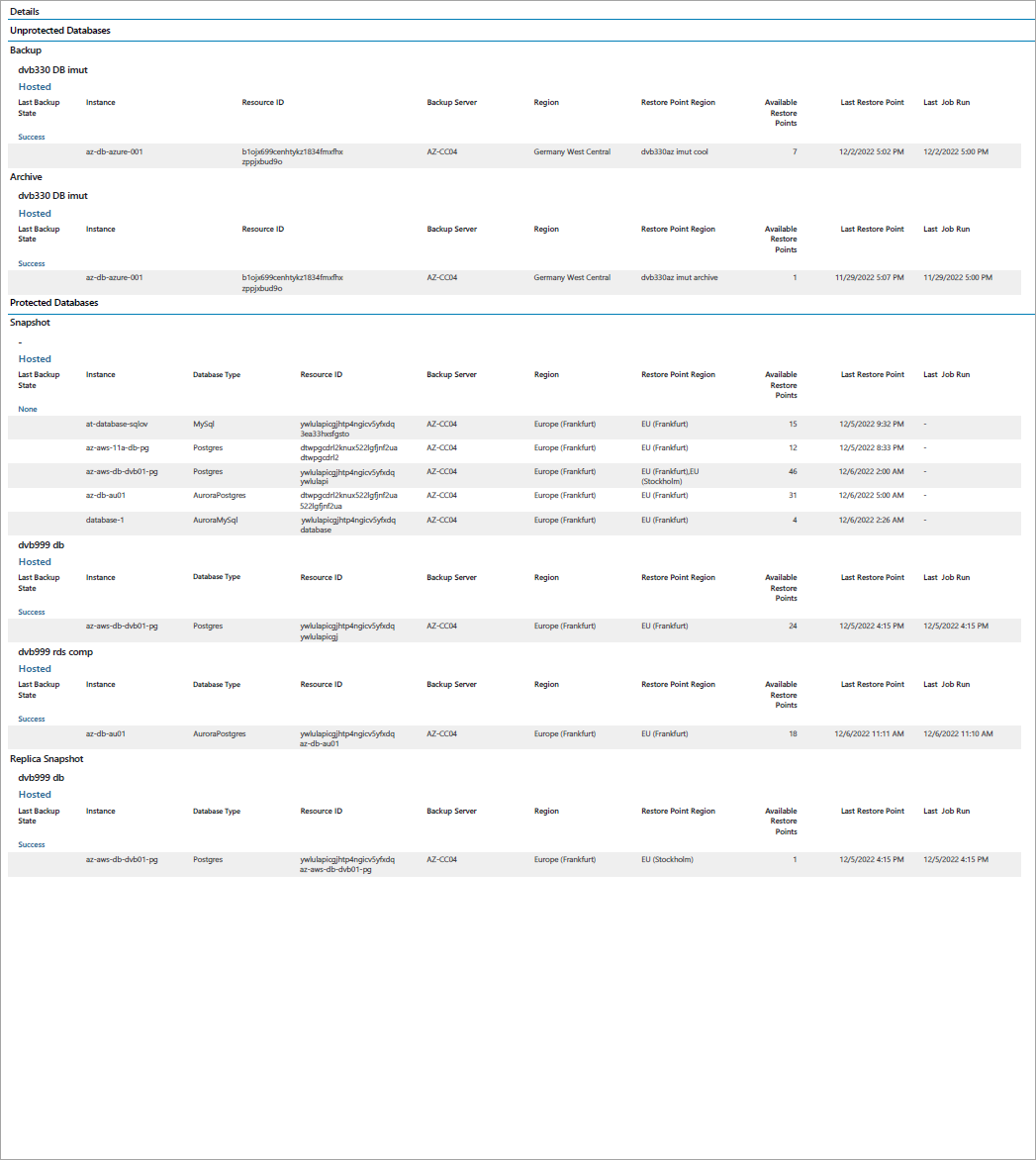 • The Details section provides information about all protected and unprotected databases including instance name, region and resource ID, database type, backup server name, restore point region, number of available restore points and date and time of the latest restore point and job run.
