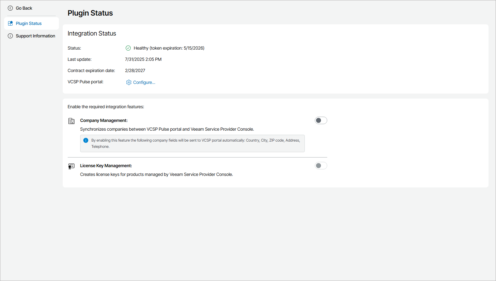 If you no longer want to manage VCSP Pulse license keys in Veeam Service Provider Console, you can remove plugin connection. After you disconnect VCSP Pulse plugin, company mapping and merge will be reset and you will not be able to assign VCSP Pulse license keys to managed products. Licenses installed on managed products before the plugin disconnection will not be affected.