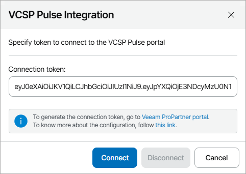 - In the VCSP Pulse Integration window, enter the connection token you generated at Step 1. Obtain VCSP Pulse Connection Token.