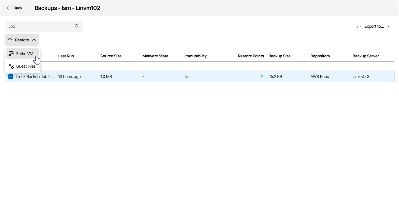 - At the top of the list, click Restore and select the necessary restore type (Entire VM, Guest Files).