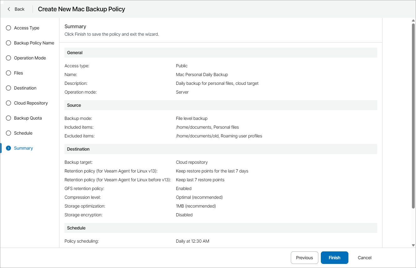 This is an archive version of the document. To get the most up-to-date information, see the current version. Step 15. Review Backup Policy Settings At the Summary step of the wizard, review settings of the configured backup policy and click Finish.