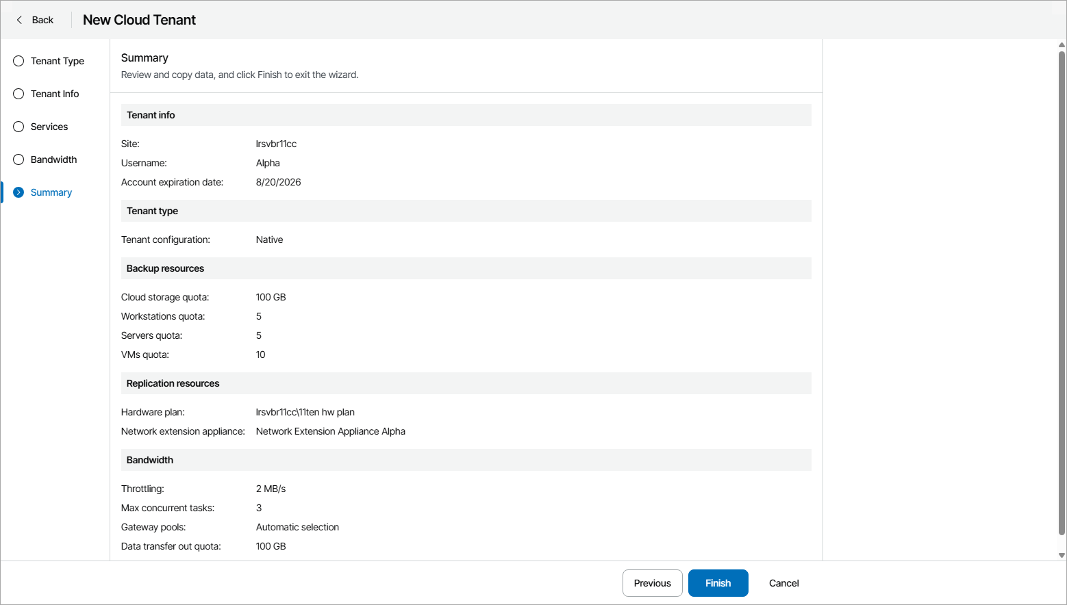 At the Summary step of the wizard, review the cloud tenant account settings and click Finish.