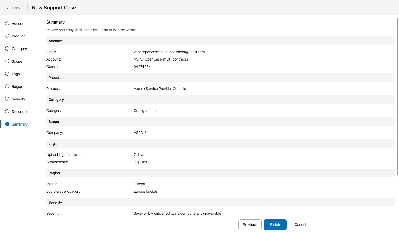 At the Summary step of the wizard, review the support case configuration and click Finish.