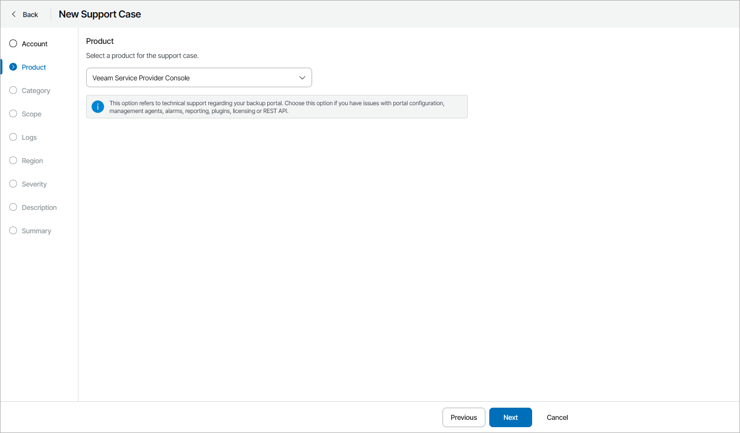 This is an archive version of the document. To get the most up-to-date information, see the current version. Step 3. Select Product At the Product step of the wizard, select a Veeam product for which you want to open a support case.Note that you can open a support case only for a product included in your Veeam Customer Technical Support contract.