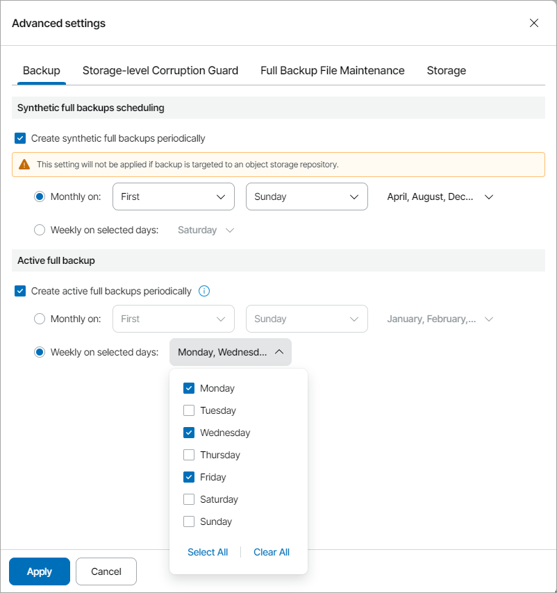 - If you want to periodically create active full backups, select the Create active full backups periodically check box. Use the Monthly on or Weekly on selected days options to define scheduling settings.