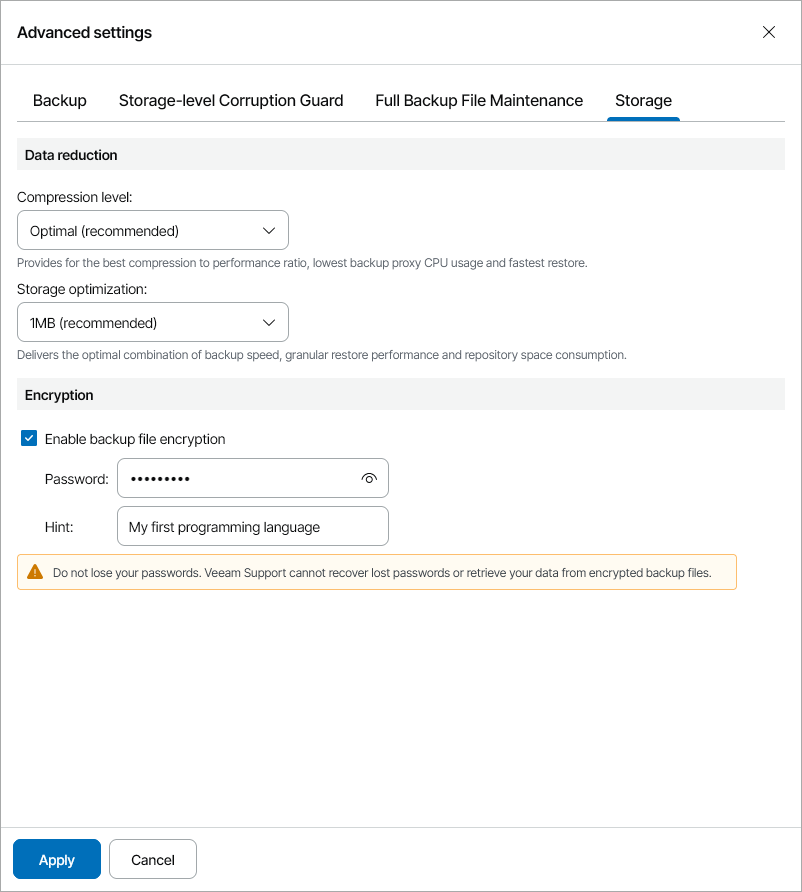 On the Storage tab of the Advanced Settings window, specify storage settings for the backup job: