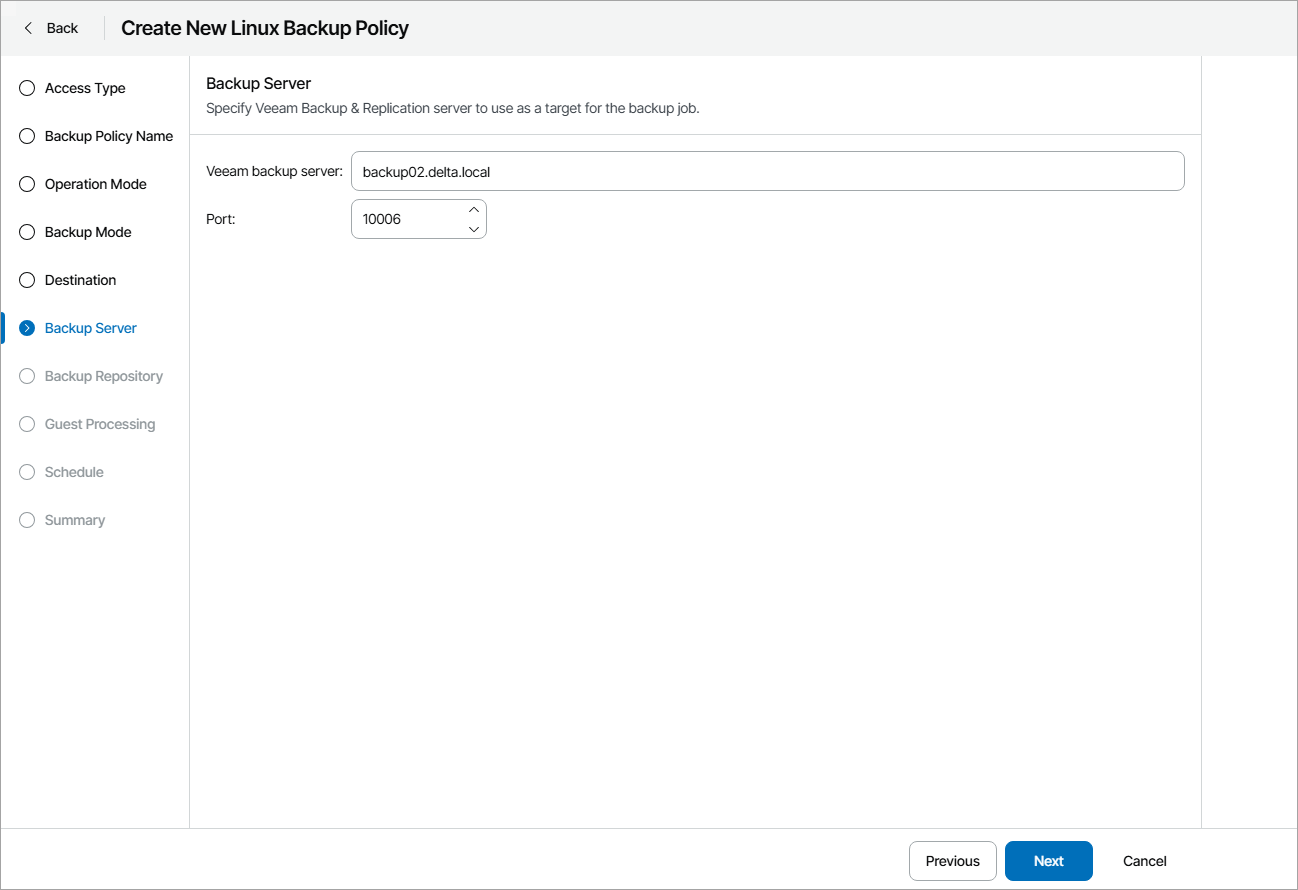 The Backup Server step of the wizard is available if at the Destination step you have chosen to store backup files on a Veeam backup repository.