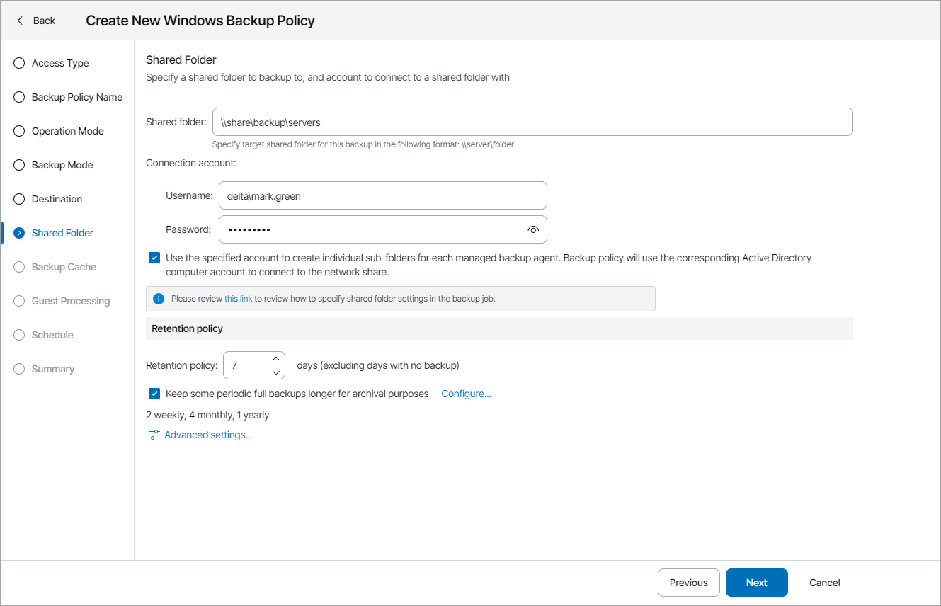 The Shared Folder step of the wizard is available if at the Destination step you have chosen to save the backup in a network shared folder.