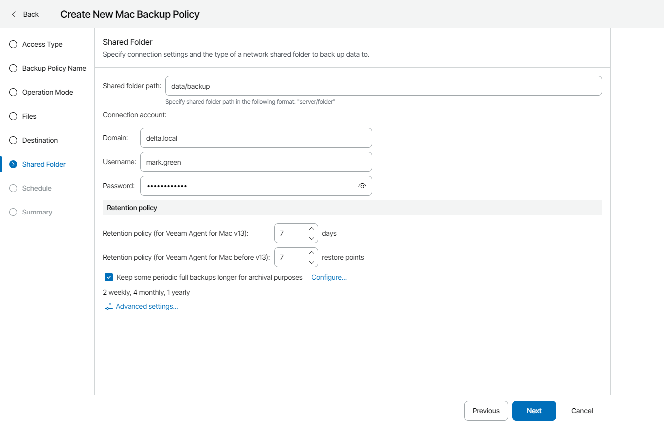 2. In the Connection account fields, specify domain name and user name and password of the account that has access permissions on this shared folder.