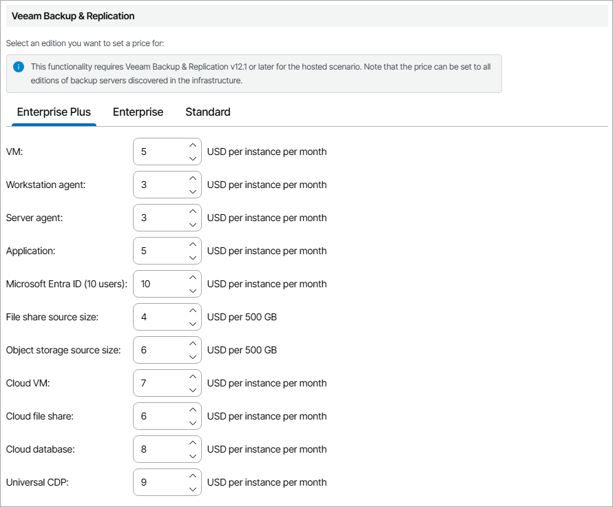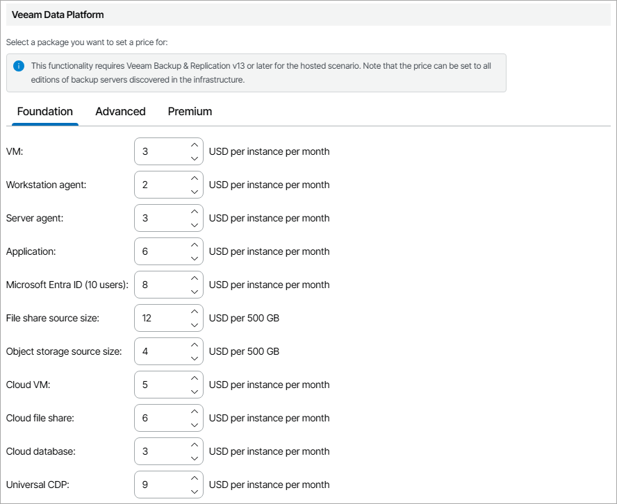 • In the Microsoft Entra ID (10 users) field, provide a charge rate for a license instance consumed by packs of 10 Microsoft Entra ID users protected by Veeam Backup & Replication with an installed Veeam Data Platform license.