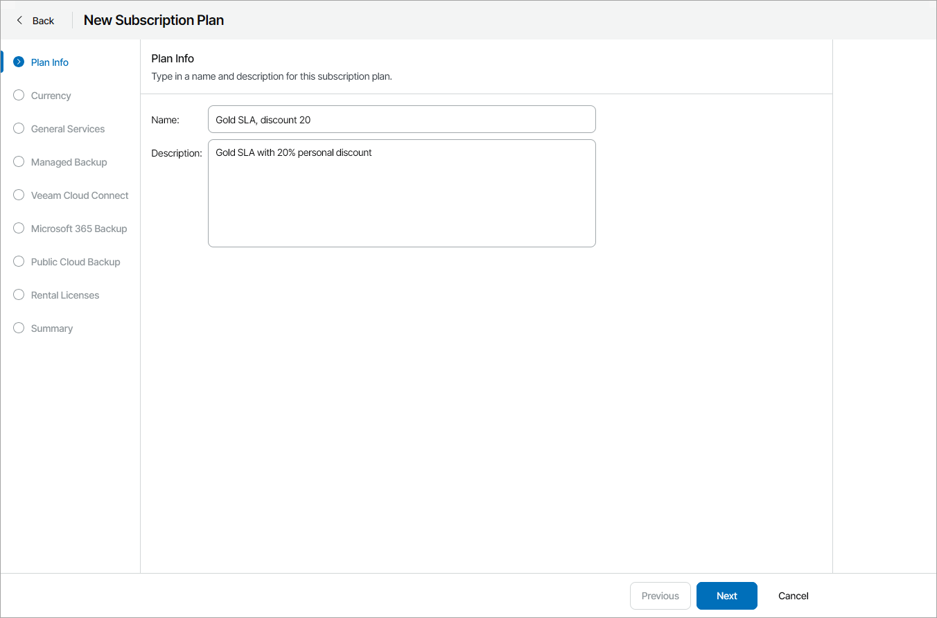 This is an archive version of the document. To get the most up-to-date information, see the current version. Step 2. Specify Subscription Plan Name and Description At the Plan Info step of the wizard, specify a name and description of a new subscription plan.