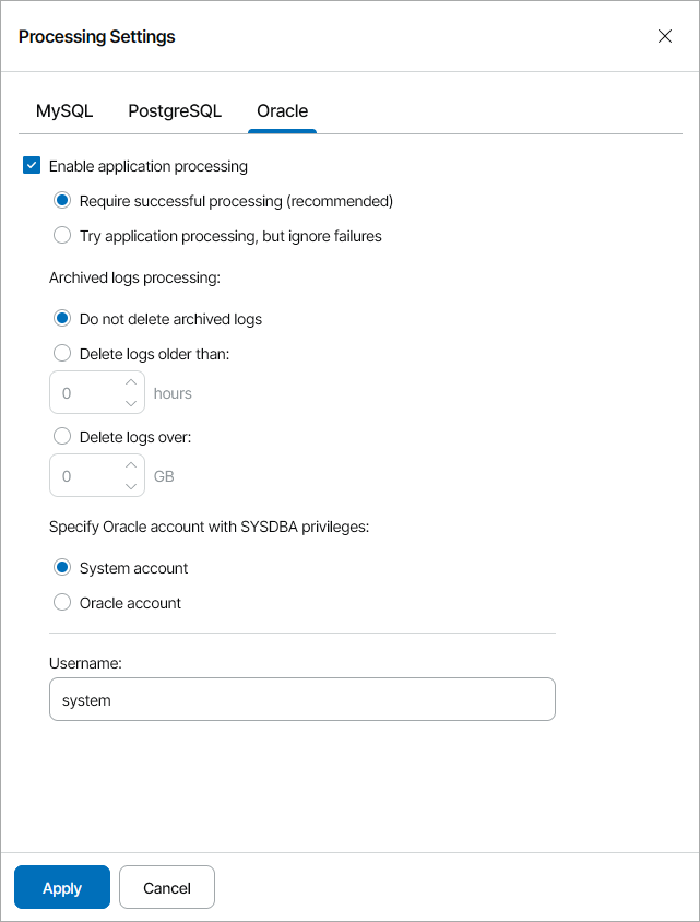 - Require successful processing. With this option selected, Veeam Agent for Linux will stop the backup process if an error occurs when processing the Oracle database system.