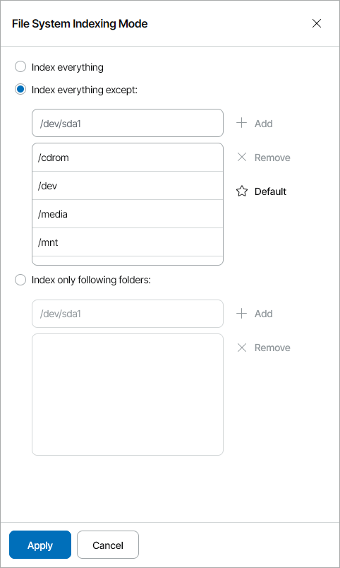 By default, system directories /cdrom, /dev, /media, /mnt, /proc, /tmp and /lost+found are excluded from indexing. You can add or delete folders using the Add and Remove buttons on the right.