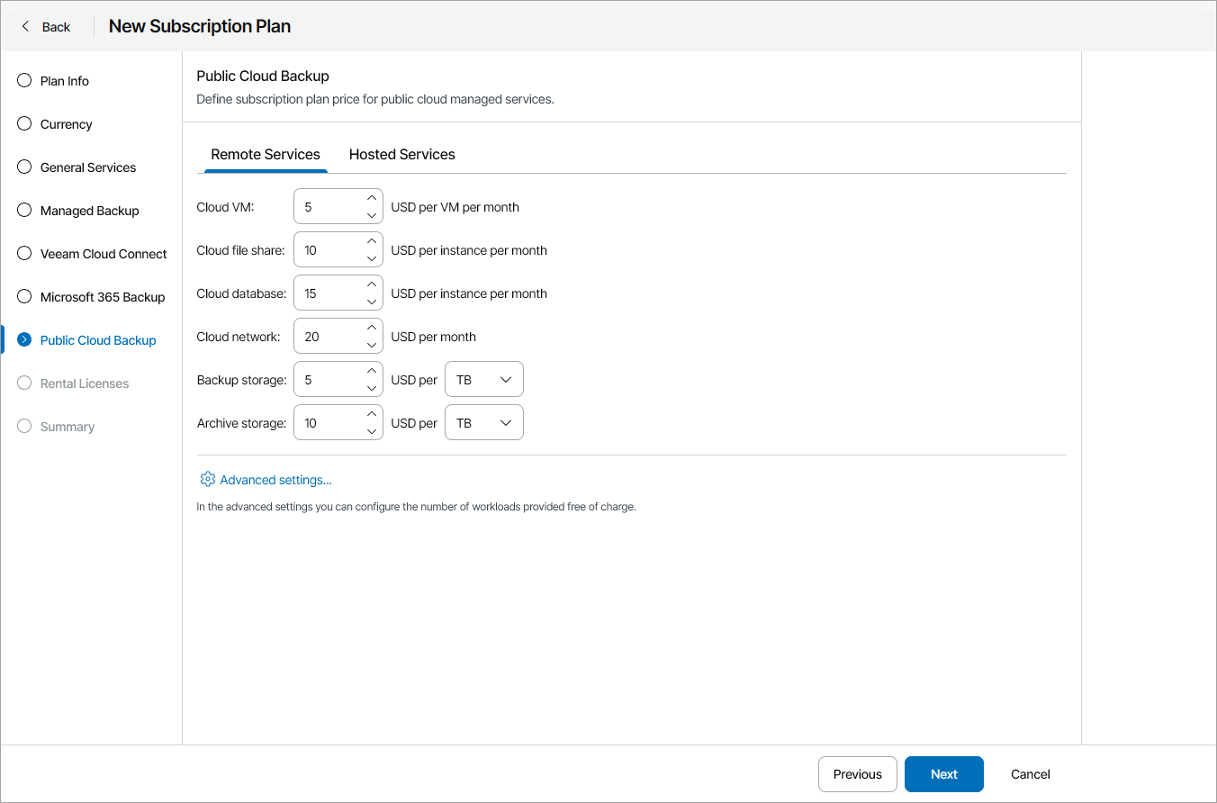 - In the Backup storage field, specify a charge rate for managing one GB or TB of backups stored in public cloud repositories.