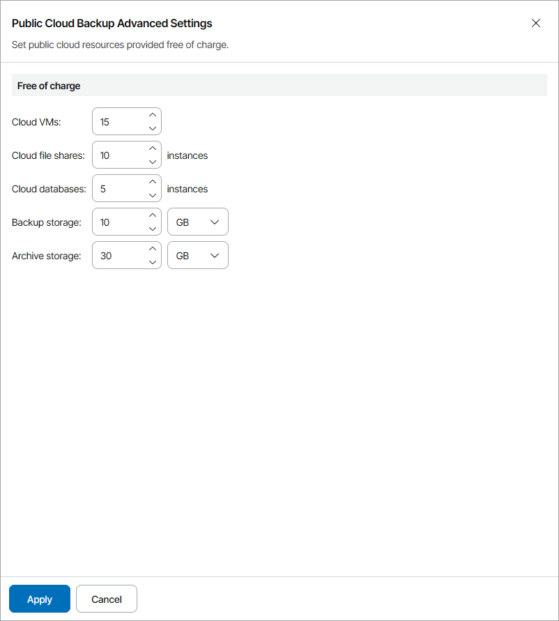 - In the Free of charge section, specify the number of workloads and the amount of storage space for which you will not apply charges.