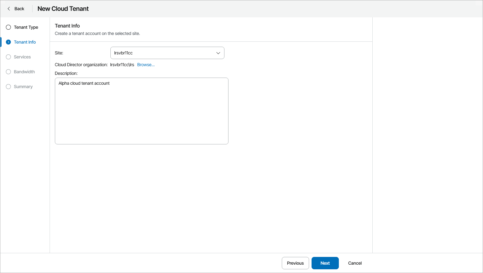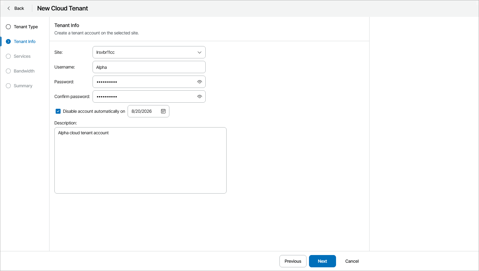 - In the Description field, add a description for the cloud tenant account.